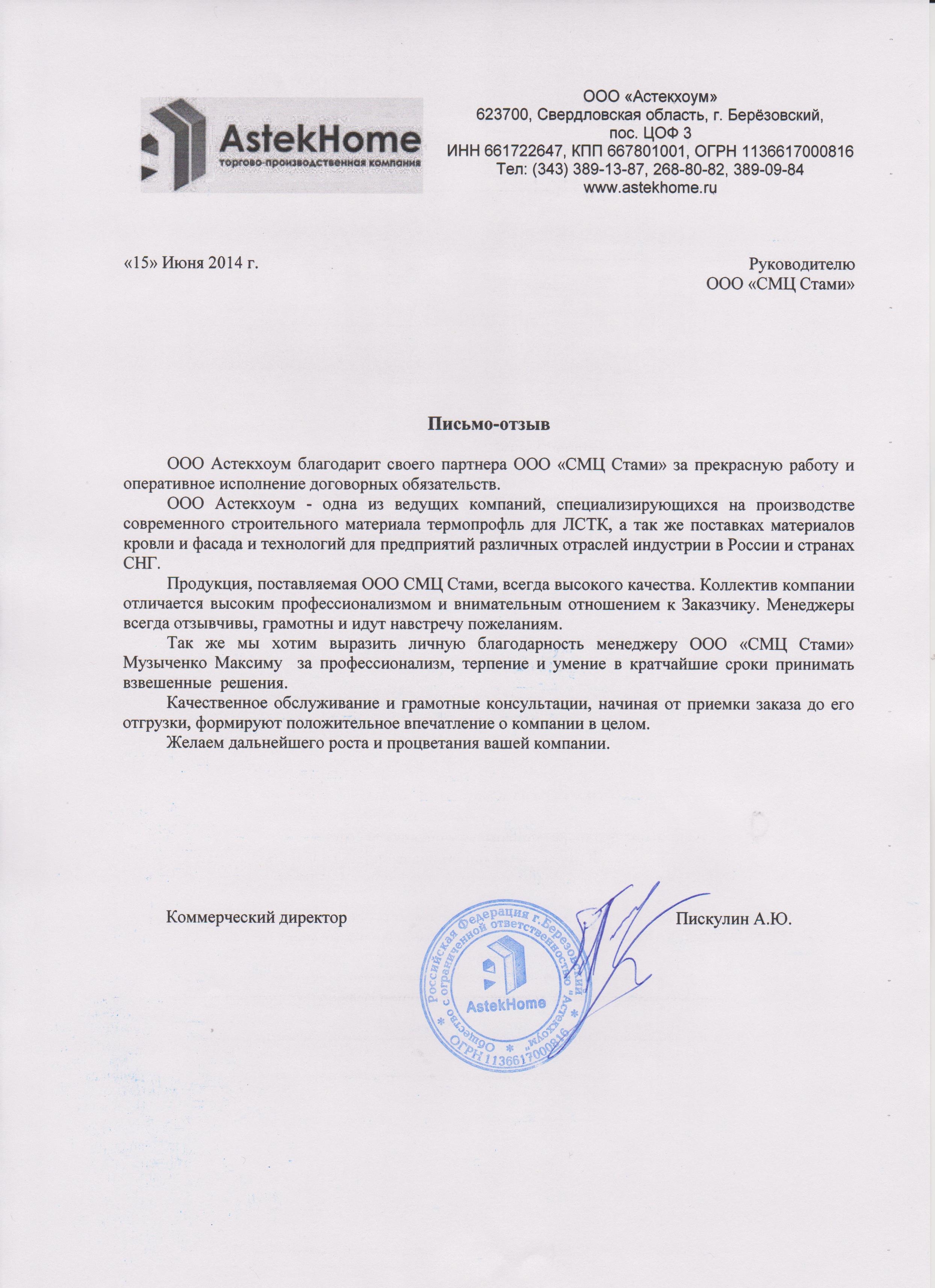 ООО Астекхоум благодарит своего партнёра ООО «СМЦ Стами» за прекрасную работу и оперативное исполнение договорных обязательств… Продукция, поставляемая ООО СМЦ Стами, всегда высокого качества. Коллектив компании отличается высоким профессионализмом и внимательным отношение к Заказчику… Качественно обслуживание и грамотные консультации, начиная от приёмки заказа до его отгрузки, формируют положительное впечатление о компании в целом. Желаем дальнейшего роста и процветания вашей компании.